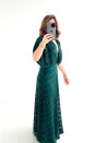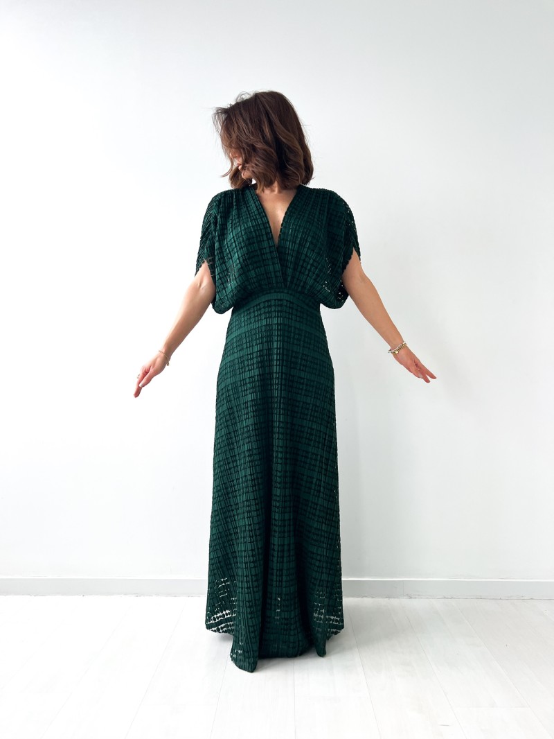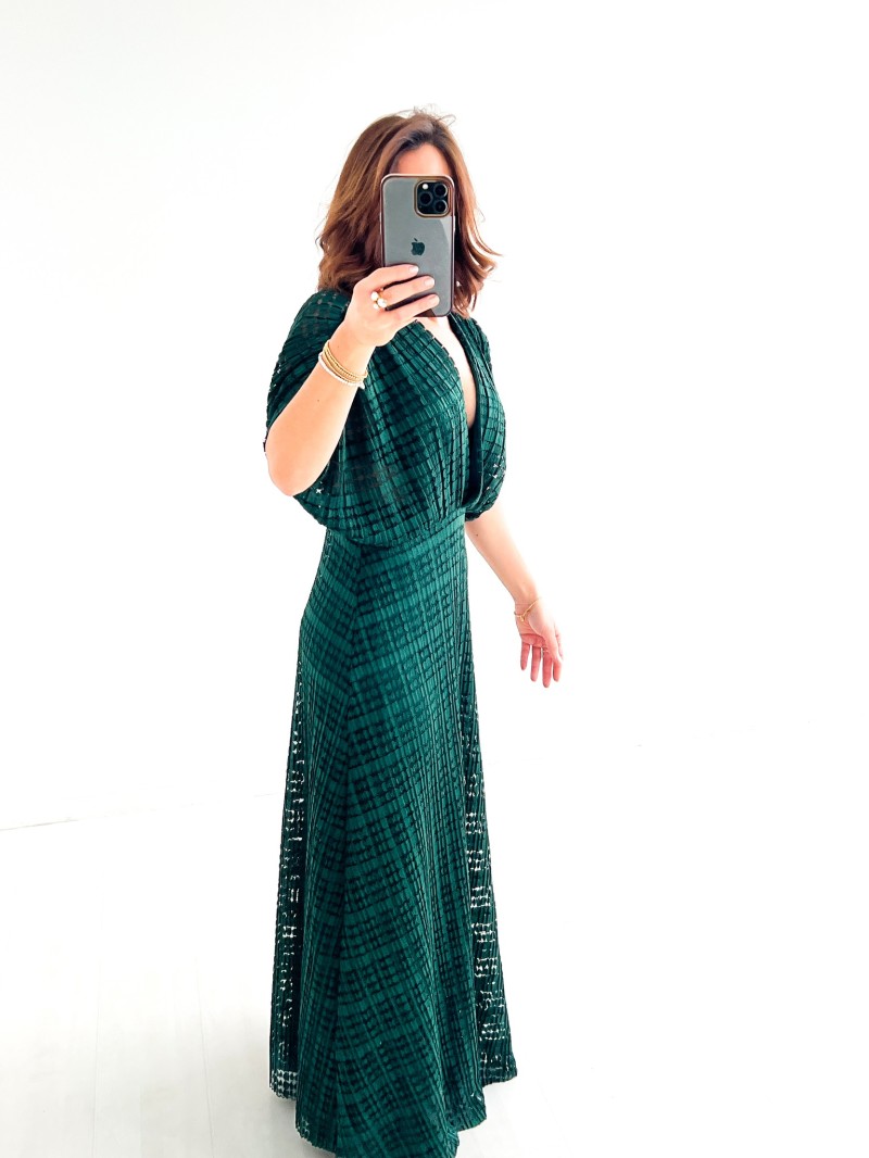 De Marianne jurk is een elegant, luchtig stuk, perfect voor ceremonies en avondjes uit. De opengewerkte stof met textuur voegt een unieke charme toe, terwijl de gekruiste halslijn en de volle mouwen een vrouwelijk silhouet vormen. De elastische tailleband biedt ideaal comfort en een chique, vloeiende pasvorm.
