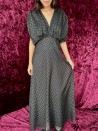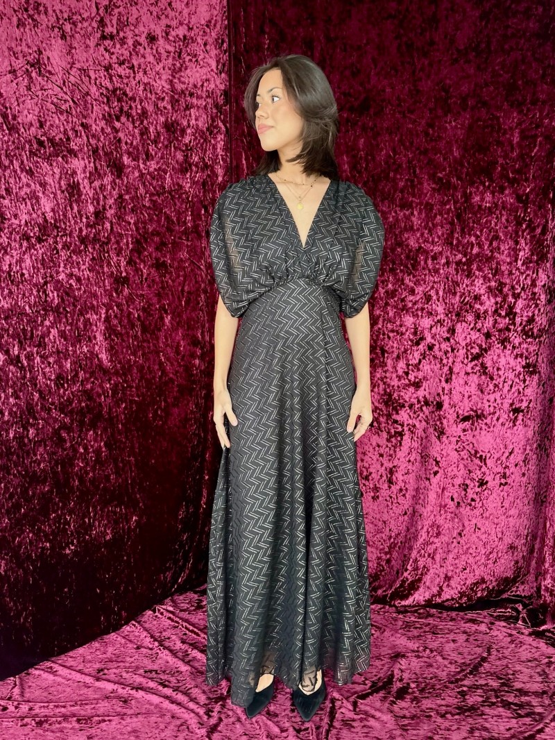 De Léonie jurk accentueert het figuur met het delicate geometrische goudkleurige patroon en de diep uitgesneden halslijn, die op zijn plaats wordt gehouden door een elegante strik op de rug. Vloeiend, vrouwelijk en gemaakt in Frankrijk, biedt het een verfijnde, lichtgewicht look voor alle geklede gelegenheden. Een opvallend ontwerp dat zowel comfortabel als flatterend is.