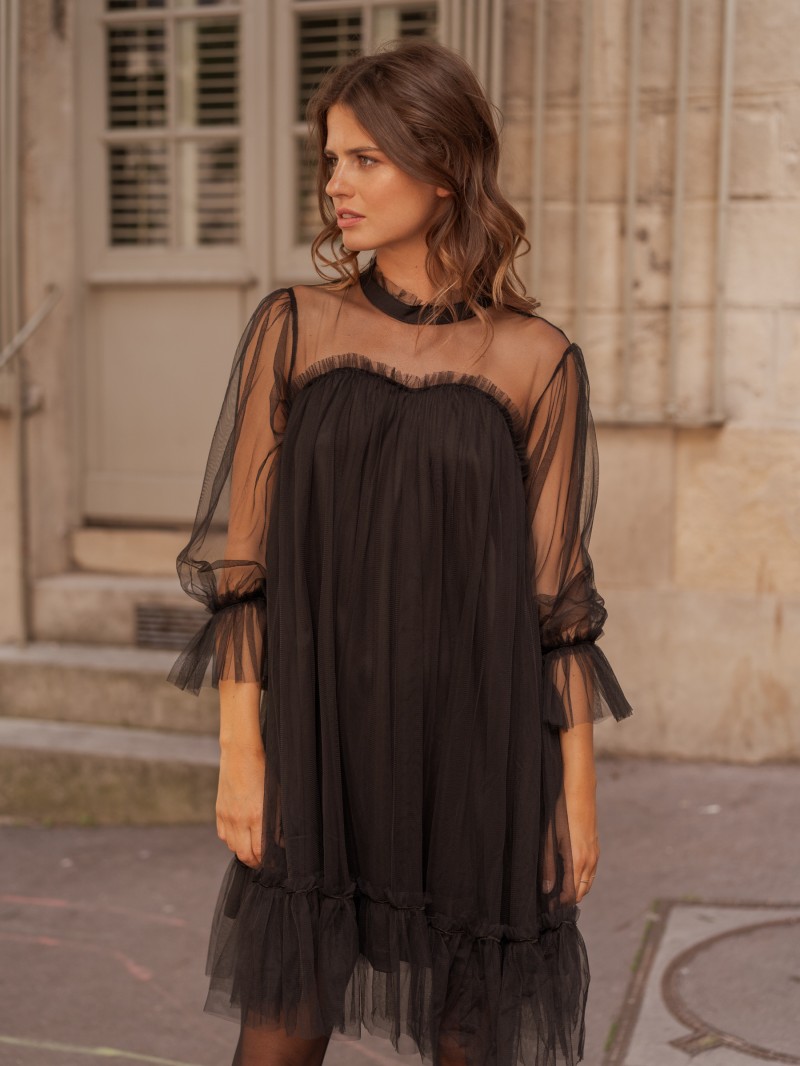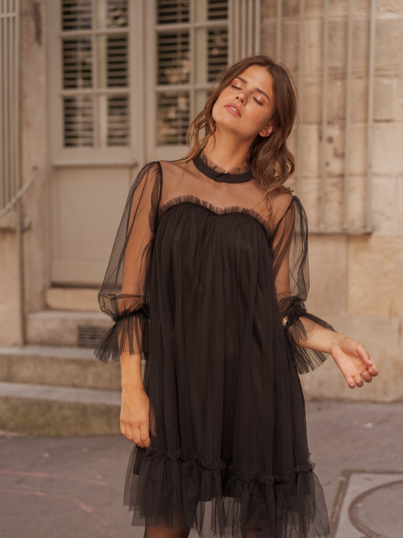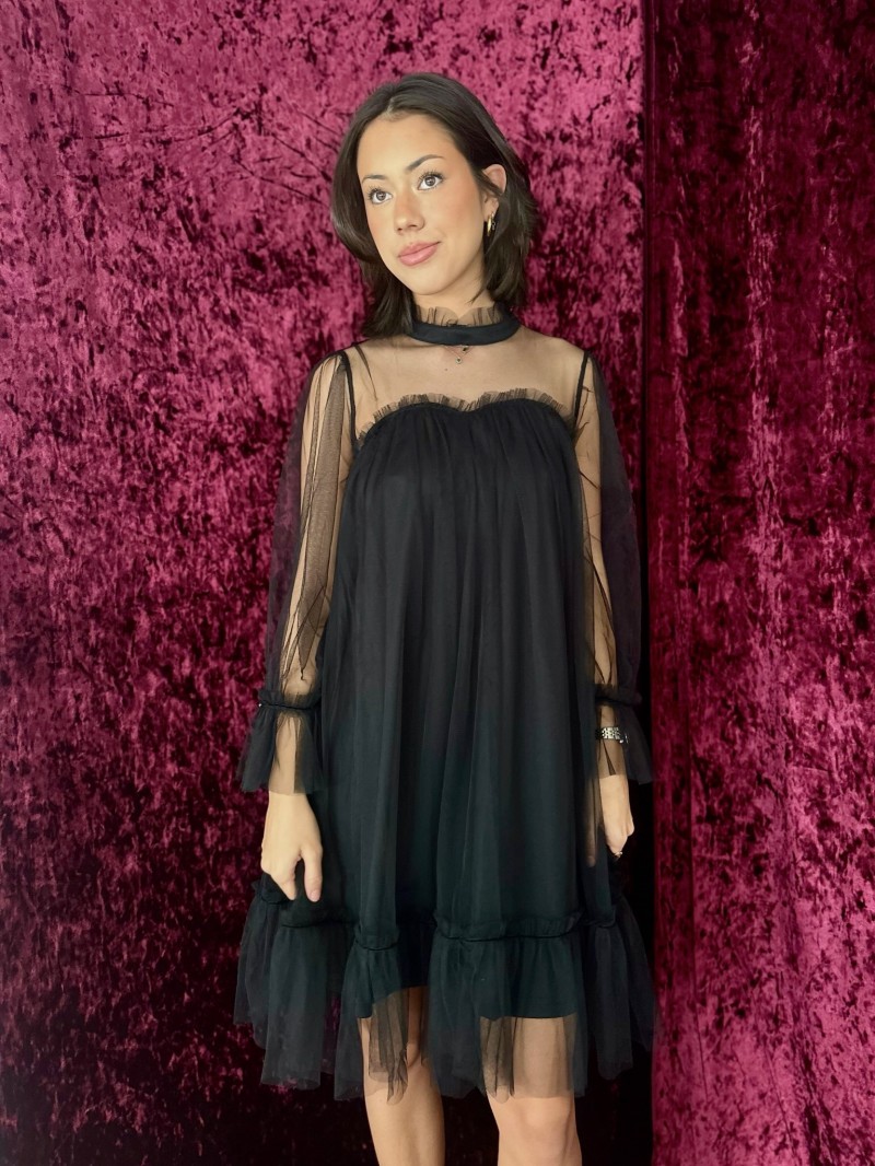 De Elora Tulle Dress laat het figuur beter uitkomen dankzij de luchtige sluier en delicate transparantie. De vloeiende snit en stomende valling creëren een verfijnde, vrouwelijke look, perfect voor avonden, feestjes en elegante gelegenheden. Lichtgewicht en comfortabel, onweerstaanbaar romantisch en toch gemakkelijk te dragen.