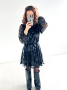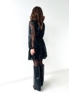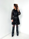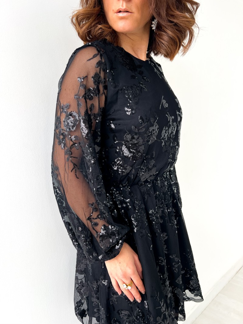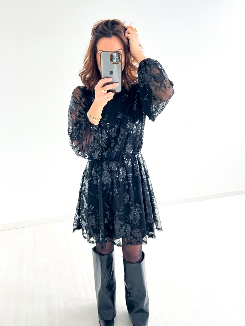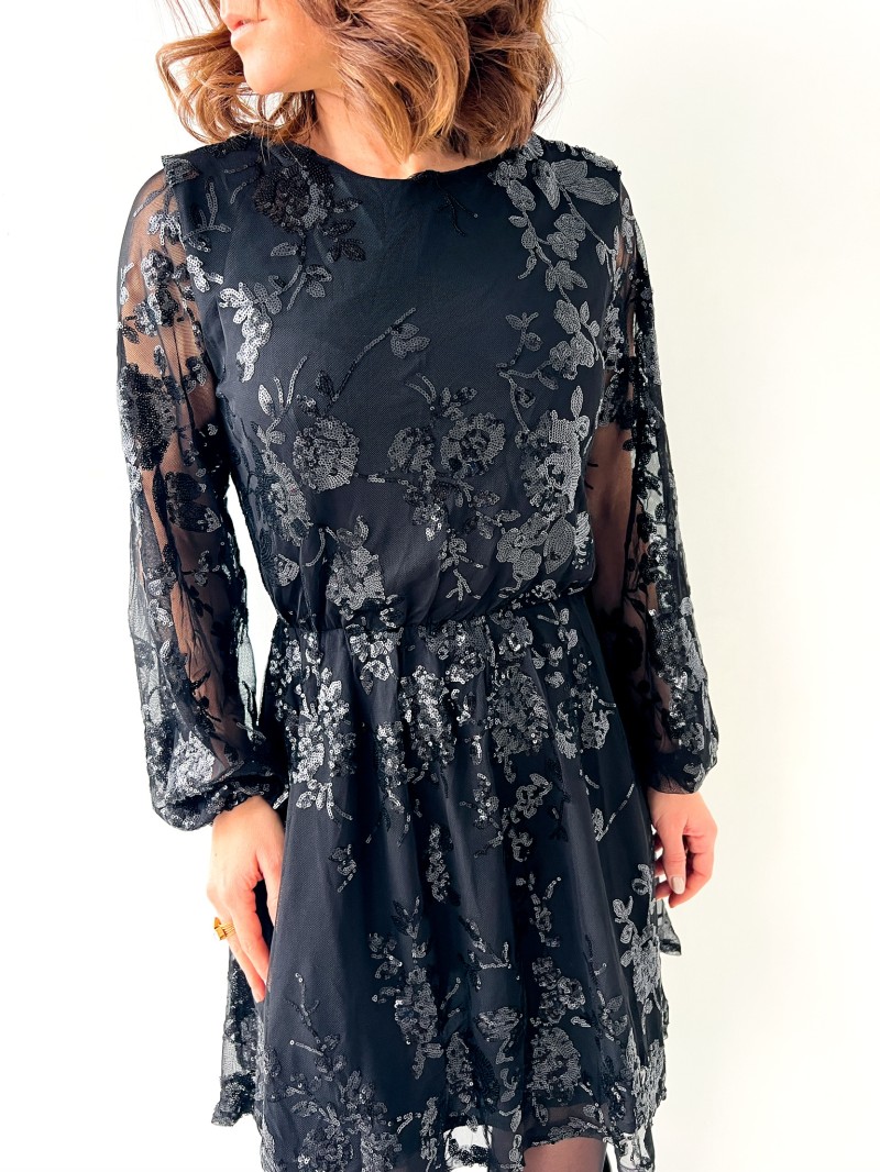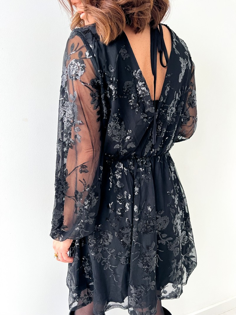 Een elegante, vrouwelijke korte jurk, bewerkt in transparantie met een spel van delicate pailletten. Het vloeiende model en de gemarkeerde taille zorgen voor een flatterend silhouet, terwijl de halsuitsnijding overgaat in een ravissante scoop back, die vastgebonden wordt voor een verfijnde afwerking. Een gekleed stuk, perfect voor avondjes uit en speciale gelegenheden.