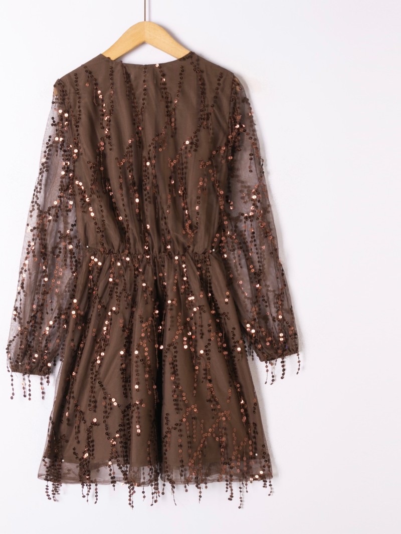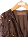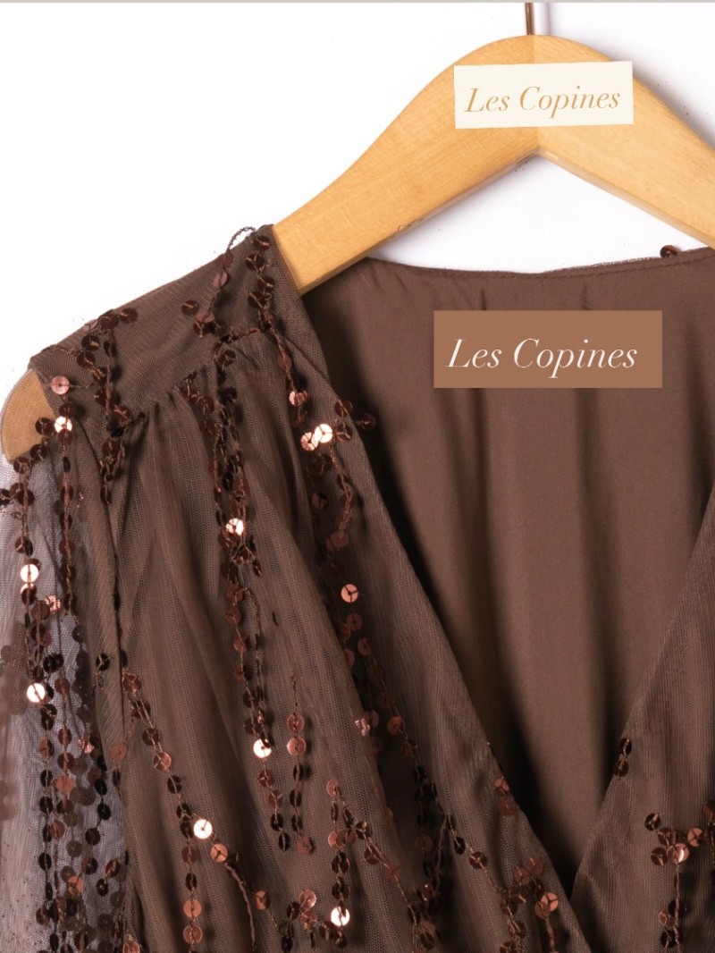 Een oogverblindende korte jurk met een vloeiende pasvorm en flatterende overslagstijl. De lichtgewicht stof is volledig versierd met delicate pailletten die het licht vangen bij elke beweging. Een feestelijk, vrouwelijk en verfijnd stuk, perfect om avondjes uit en speciale gelegenheden op te vrolijken.