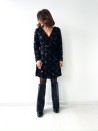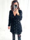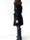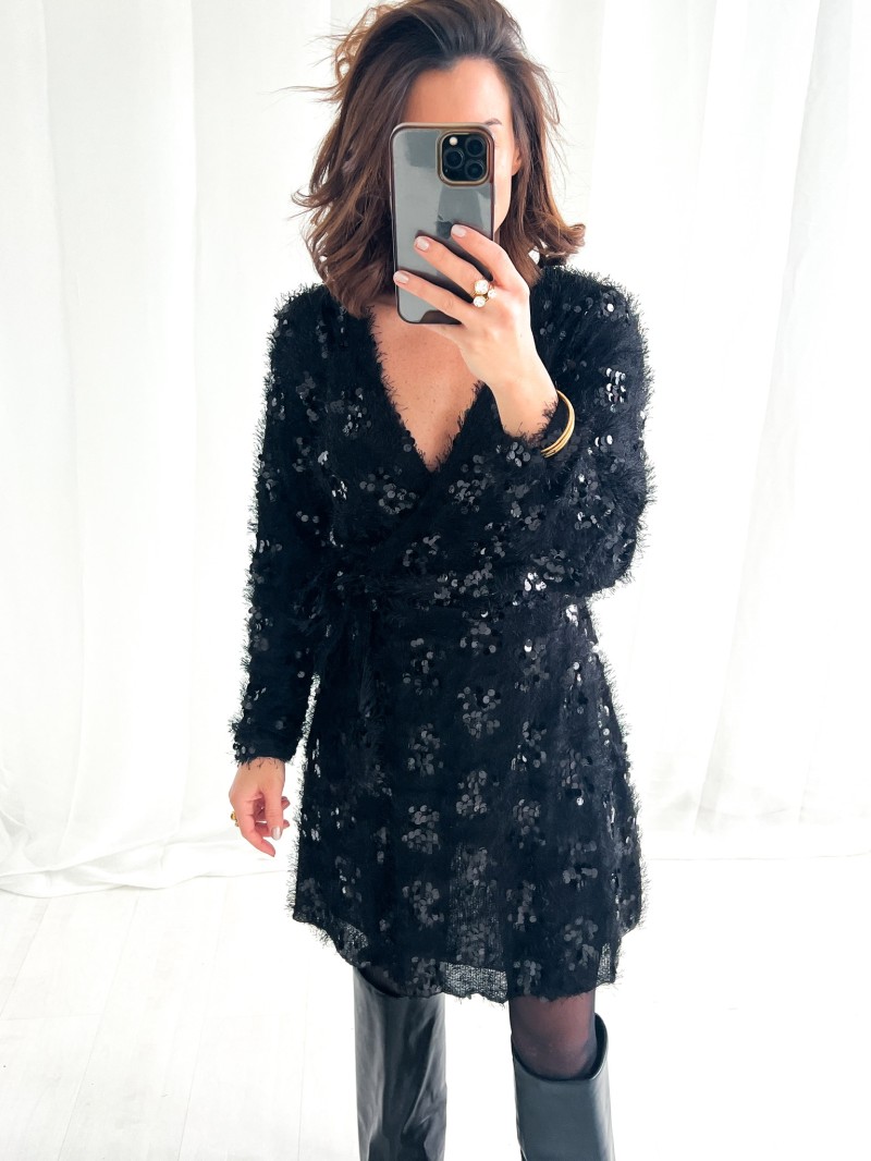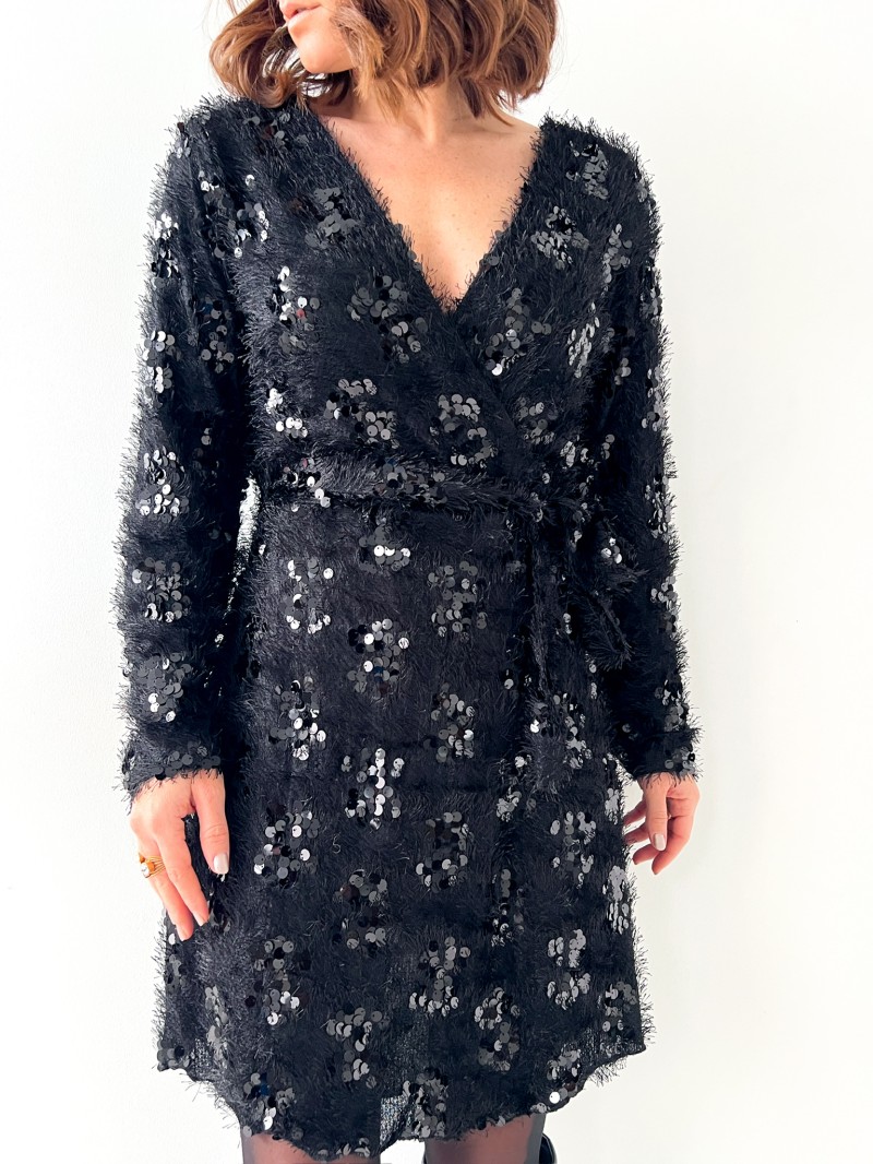 Een glinsterende korte jurk met een vloeiende valling en een unieke pluizige textuur. De gekruiste halslijn accentueert op subtiele wijze het decolleté, terwijl de elastische tailleband het silhouet comfortabel benadrukt. Een feestelijk, vrouwelijk en stralend stuk - perfect om te schitteren bij speciale gelegenheden.