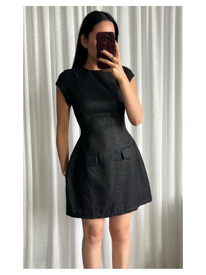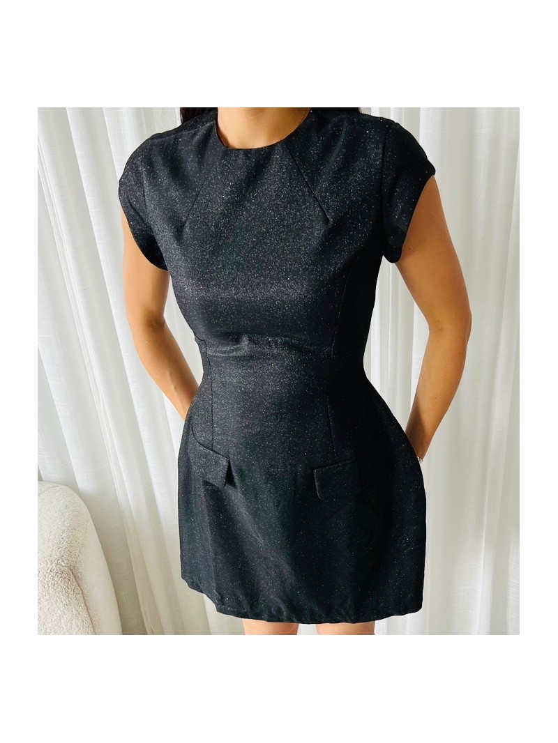 Een korte jurk met een gestructureerde snit, ontworpen in een subtiel glanzende stof die het licht met elegantie vangt. De omsluitende taille flatteert het figuur, terwijl de korte mouwen voor een moderne, gestroomlijnde touch zorgen. Een chique stuk dat gemakkelijk te dragen is voor een avondje uit of een speciale gelegenheid.