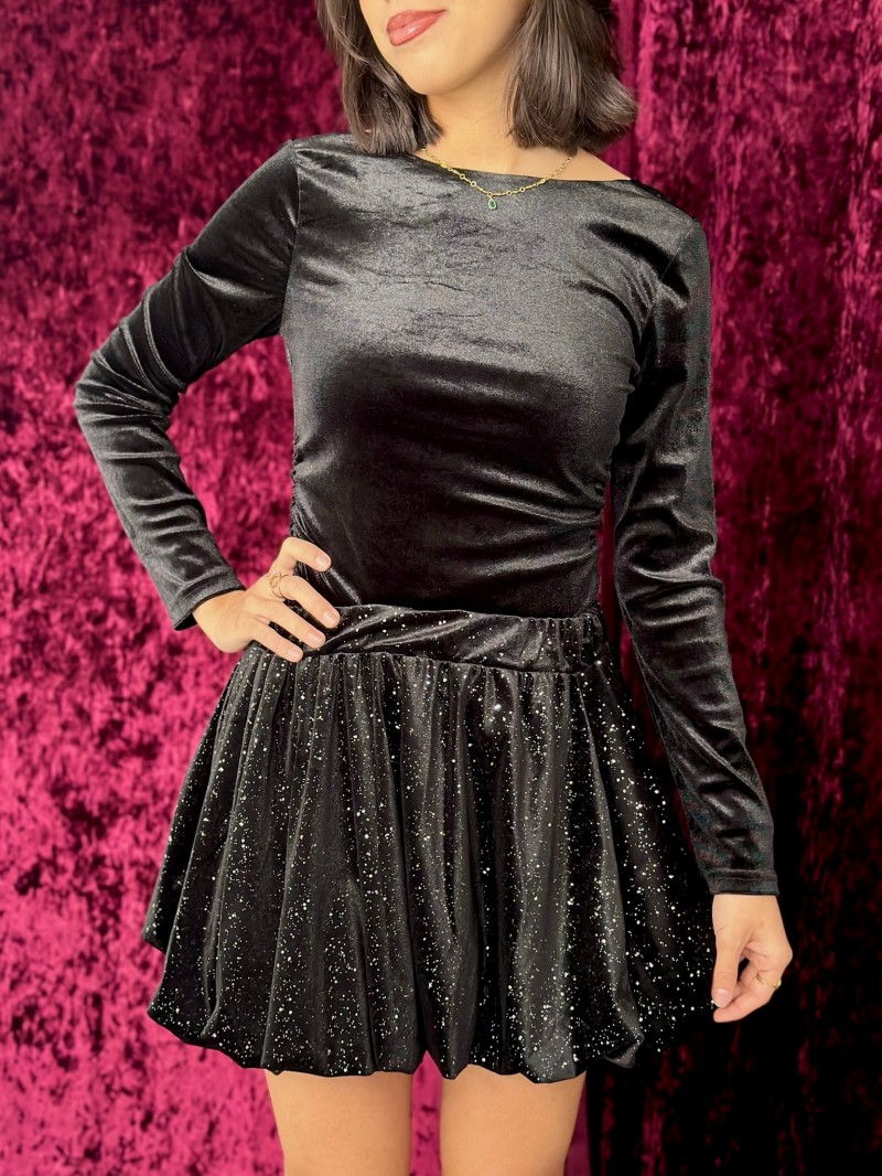 Een mooi kort zwart rokje bezaaid met kleine glittertjes, perfect om een avondoutfit op te fleuren of een eenvoudige look een feestelijk tintje te geven. De zachte, vloeiende stof zorgt voor een elegante maar comfortabele pasvorm.