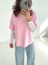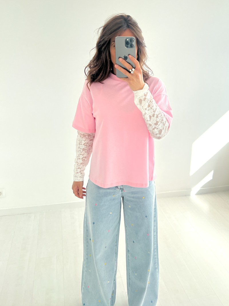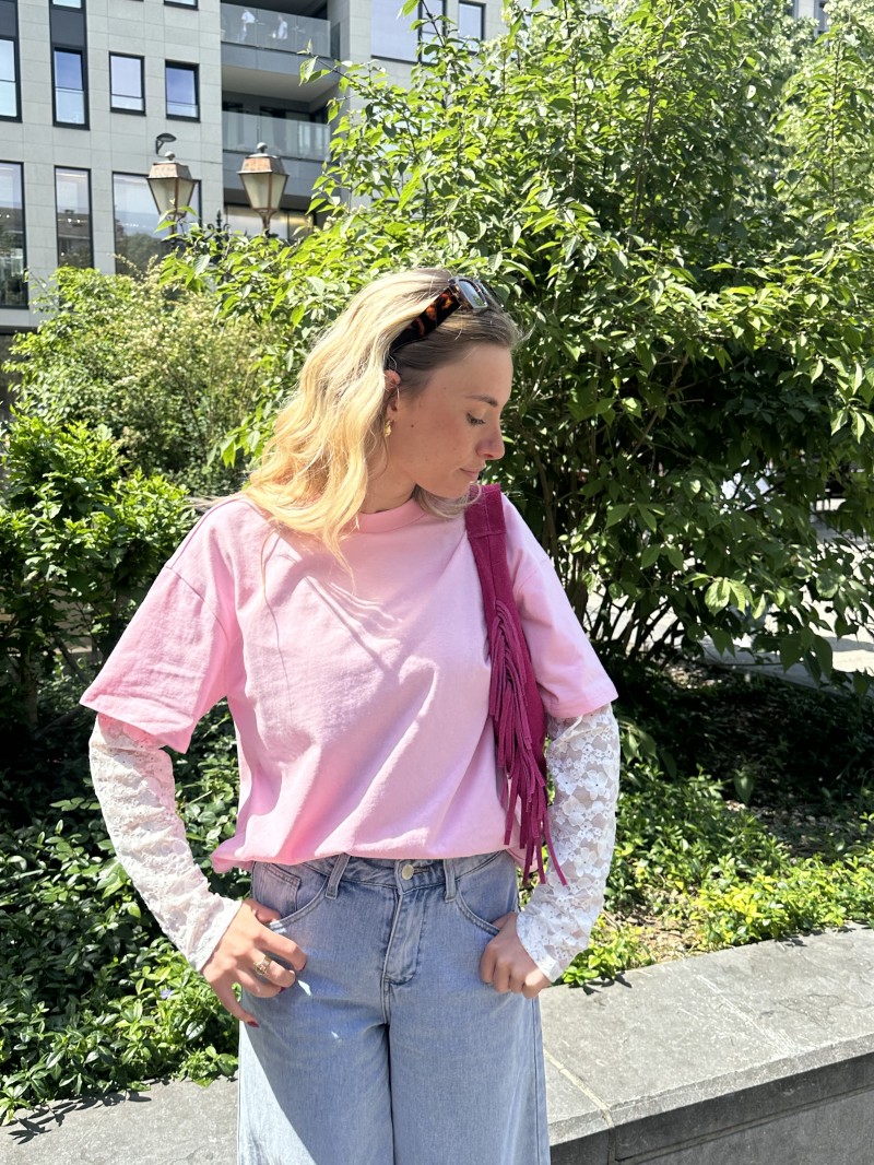Het Kelly Dentelle T-shirt geeft een romantische draai aan het klassieke witte (of zwarte) T-shirt. De eenvoudige voorkant wordt gecombineerd met lange mouwen van delicate, licht transparante bloemenkant. Een perfecte balans tussen comfort en elegantie, ideaal om een jeans op te fleuren of een casual look vrouwelijker te maken. Draag het dag en nacht, zo vaak je maar wilt!