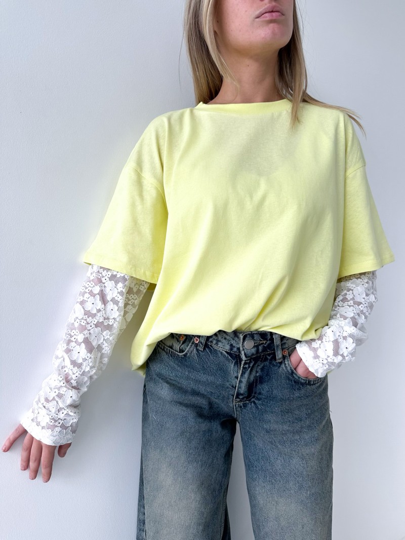 Het Kelly Dentelle T-shirt geeft een romantische draai aan het klassieke witte (of zwarte) T-shirt. De eenvoudige voorkant wordt gecombineerd met lange mouwen van delicate, licht transparante bloemenkant. Een perfecte balans tussen comfort en elegantie, ideaal om een jeans op te fleuren of een casual look vrouwelijker te maken. Draag het dag en nacht, zo vaak je maar wilt!