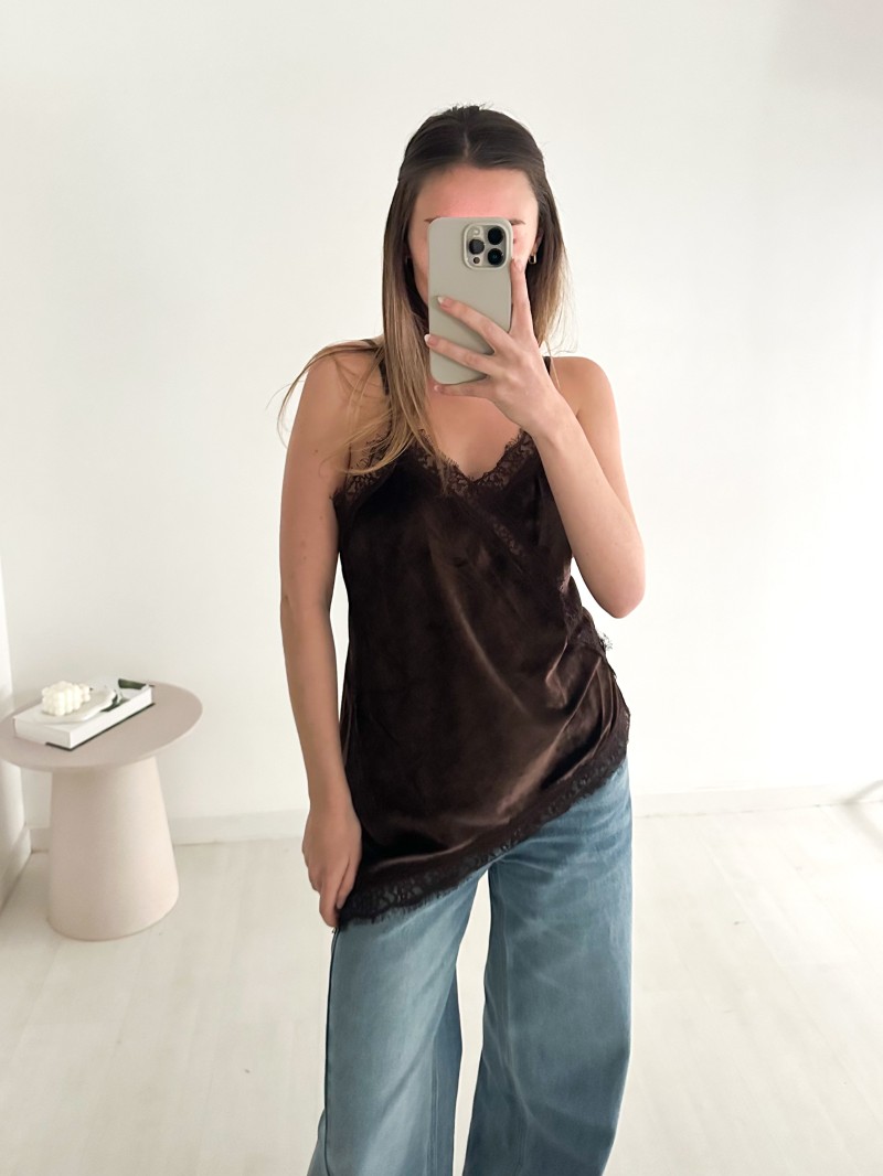 Een vrouwelijk en delicaat hemdje, gemaakt van zacht fluweel en verfijnd kant. De subtiel geaccentueerde halslijn en de soepele stof maken dit hemdje ideaal om uw outfits te verfraaien, alleen of onder een blazer.