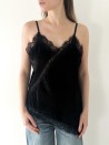 Een vrouwelijk en delicaat hemdje, gemaakt van zacht fluweel en verfijnd kant. De subtiel geaccentueerde halslijn en de soepele stof maken dit hemdje ideaal om uw outfits te verfraaien, alleen of onder een blazer.