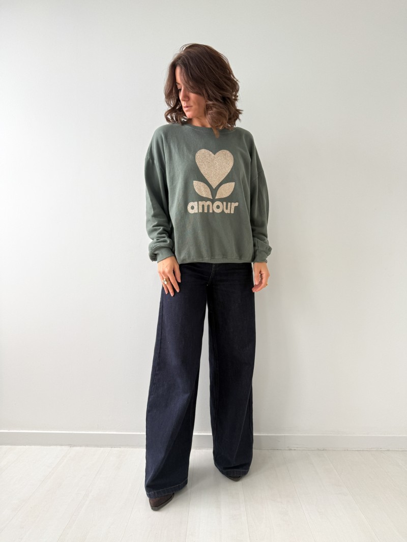 Het sweatshirt 'Amour' is een eerbetoon aan eenvoud en genegenheid, verkrijgbaar in een reeks kleuren die bij elke stijl passen. Met zijn grote hartenprint en het woord 'love' onderaan, vat dit ontwerp de essentie van positiviteit en tederheid. Dit sweatshirt is gemaakt van een zachte, comfortabele stof en is ideaal voor casual dagen of als dagelijkse boodschap van liefde. Perfect voor een knusse look, het combineert mode en comfort.