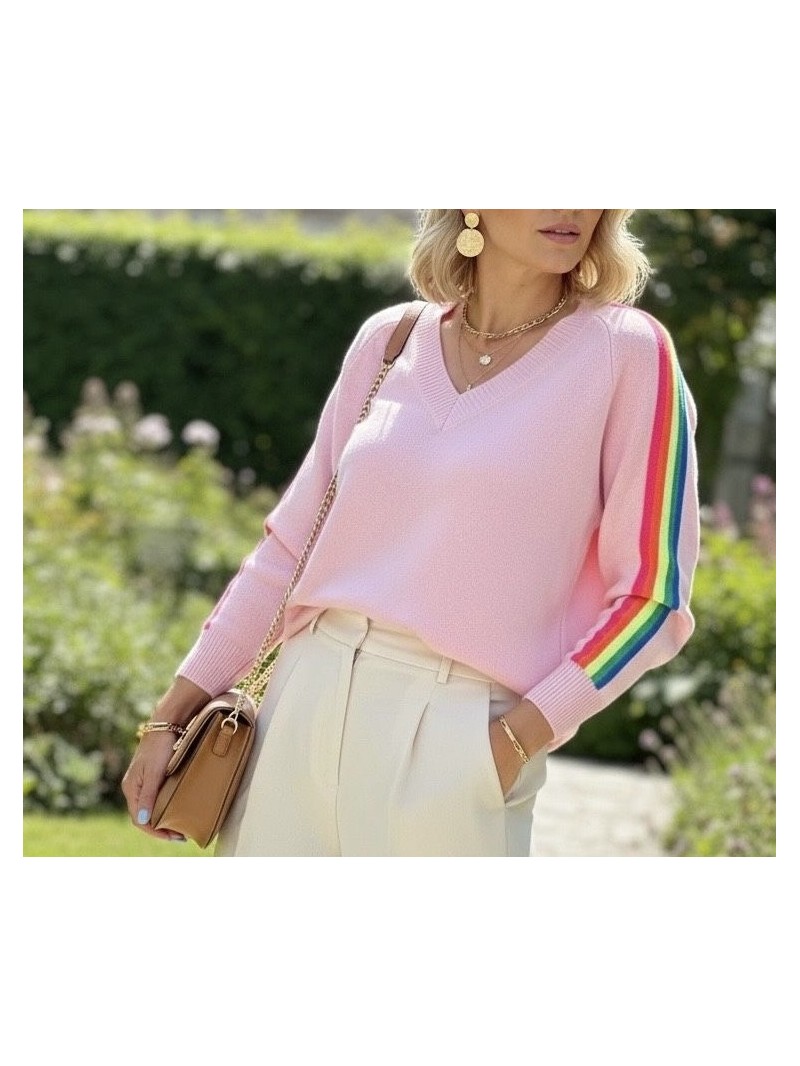 Kies voor een vrolijke stijl met de trui "Rainbow Vibes". Deze one-size-fits-all trui heeft een flatterende V-hals en heeft levendige regenboogstrepen op de mouwen, die elegant contrasteren met de witte basis. Hij is gemaakt van een zachte stof en heeft een relaxte pasvorm die comfort en moderniteit combineert. Perfect om een vleugje kleur toe te voegen aan je outfits, deze trui zonder capuchon is ideaal voor een chique casual look. De 'Rainbow Vibes' is de perfecte optie voor wie eenvoud en dynamiek wil combineren met een vleugje fantasie.