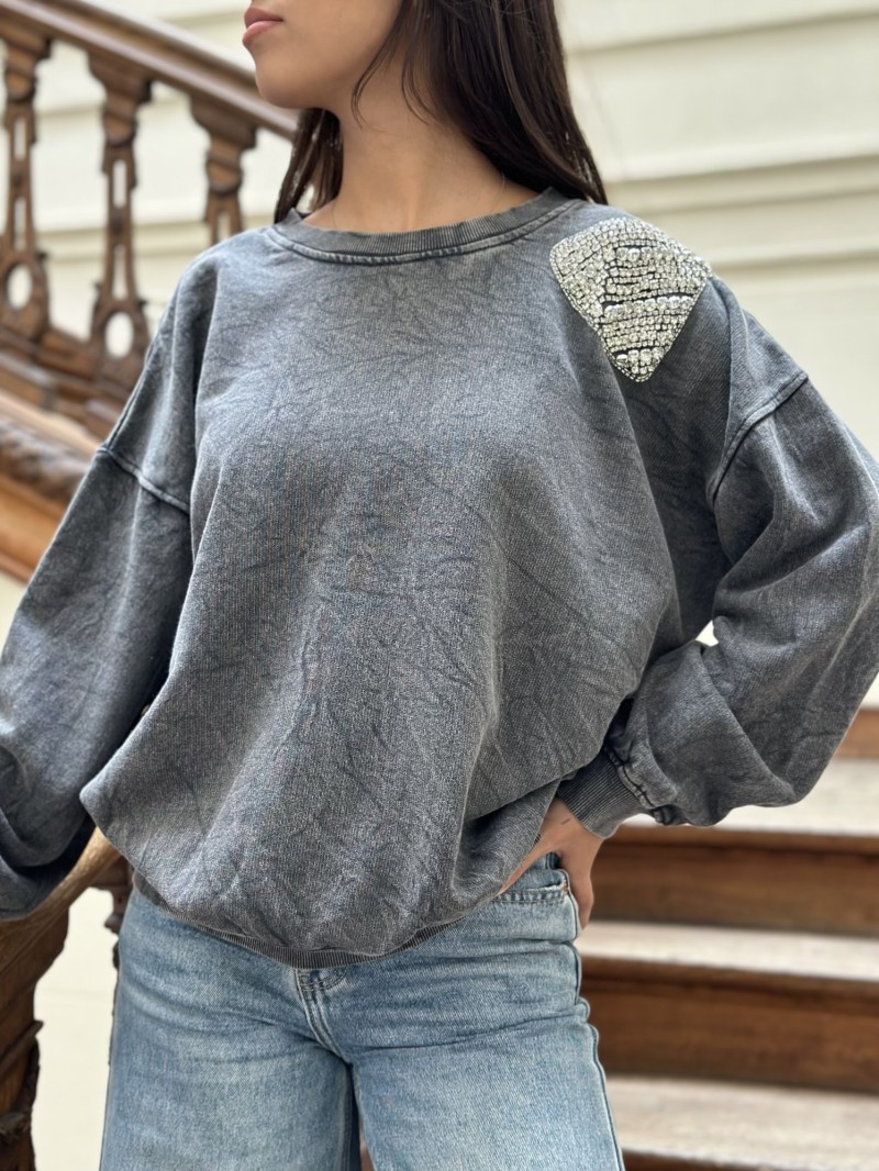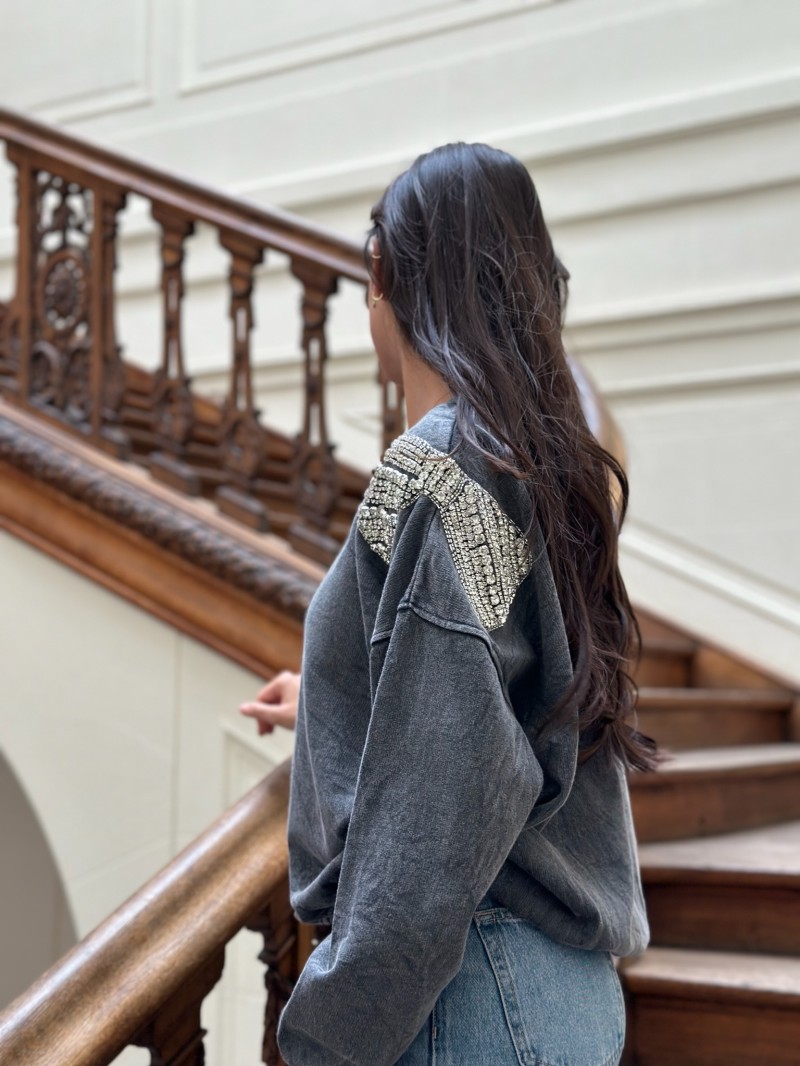 Een casual trui met een onverwacht vleugje glamour. De oversized snit en het zachte katoen maken het een comfortabel stuk, terwijl de schouder, versierd met een strass maxi strik, een echte blikvanger is. Een gedurfd contrast tussen nonchalance en glinstering.