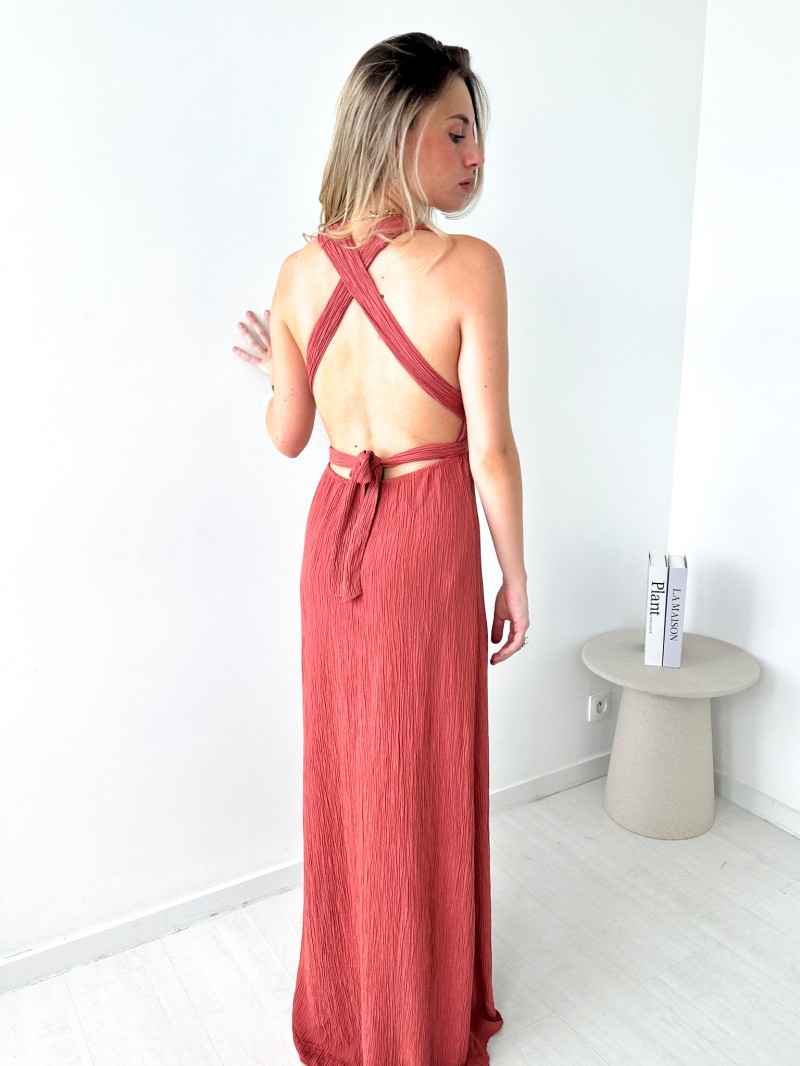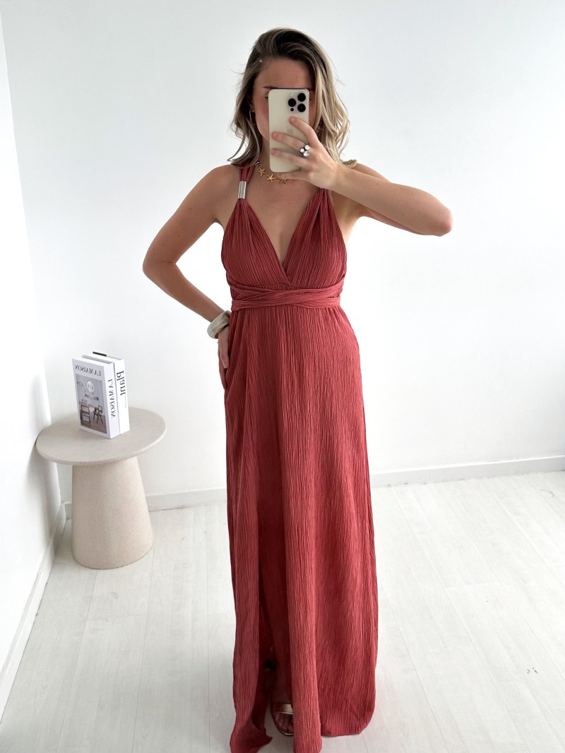 Lange, soepel vallende jurk met diep decolleté, ontworpen om het silhouet te accentueren. De achterkant kan op verschillende manieren worden vastgemaakt, afhankelijk van uw voorkeur. De zilveren details aan weerszijden van de bandjes zorgen voor een subtiele, chique touch.