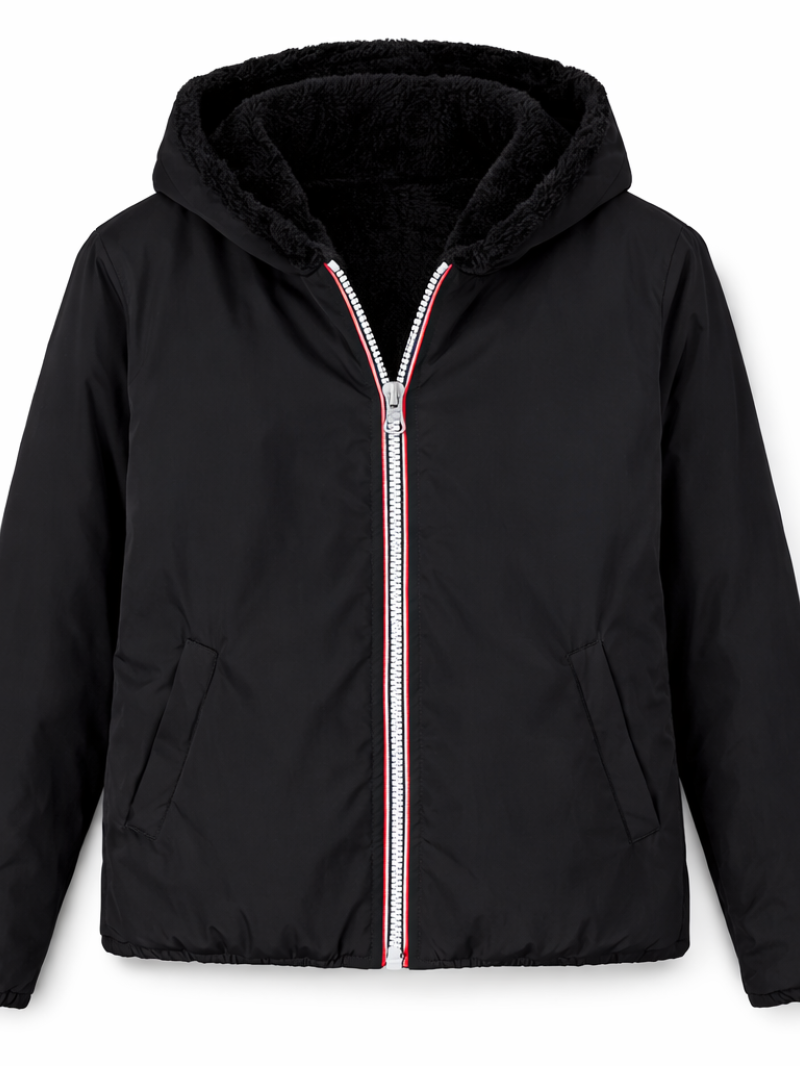 Geniet van comfort en functionaliteit met dit korte omkeerbare jack, ontworpen om aan al uw wensen te voldoen. Aan de ene kant een waterdichte buitenkant om u tegen de regen te beschermen, aan de andere kant een ultrazachte imitatiebontvoering voor een behaaglijke warmte.
